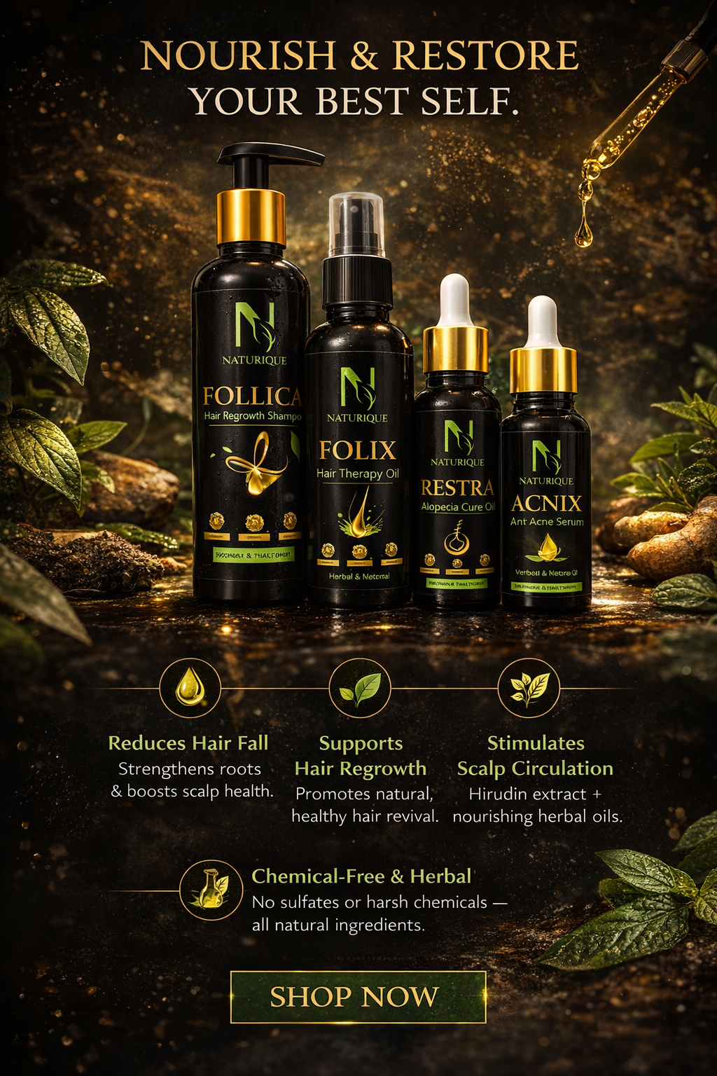 Dealing with hair fall? Follica by Naturique.pk is a herbal shampoo formulated with Hirudin extract and botanical ingredients to gently cleanse the scalp, strengthen roots, and support healthier-looking hair — naturally.